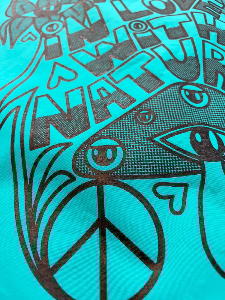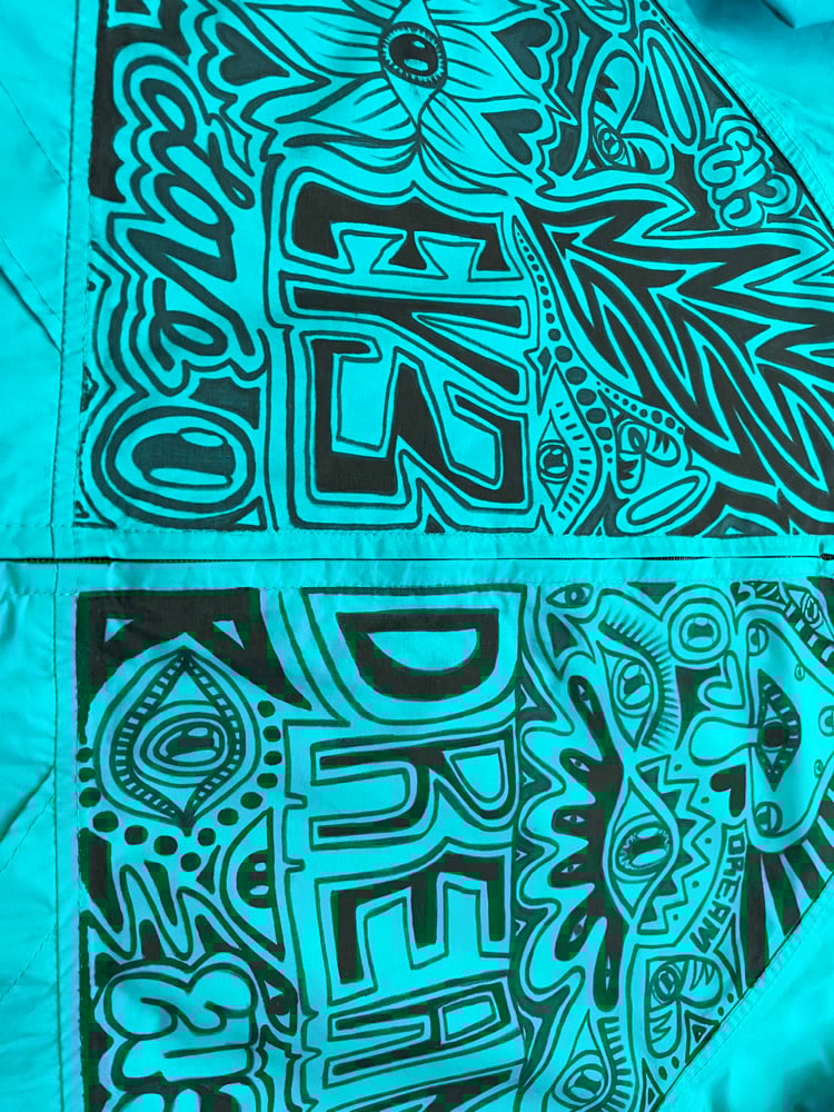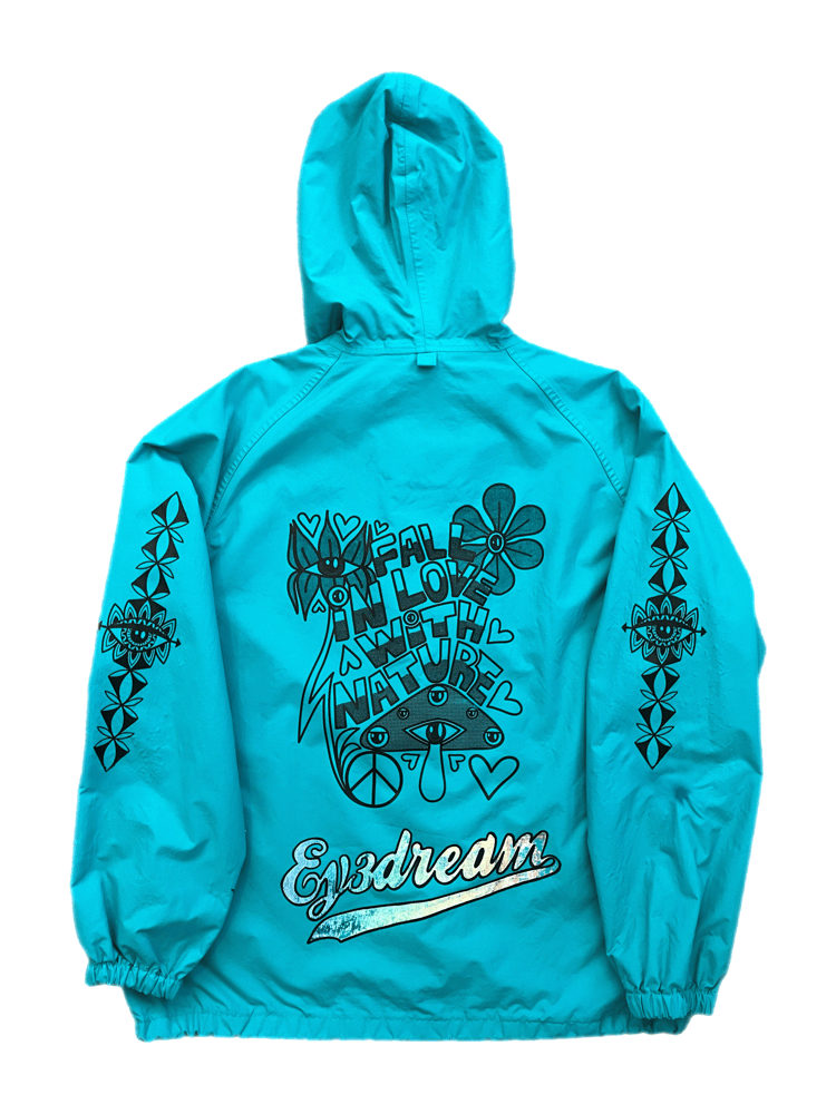 Step into a wearable canvas of consciousness with the EY3DREAM Visionary Windbreaker. Designed for dreamers, seekers, and creators, this electric turquoise jacket merges streetwear edge with psychedelic artistry. The hand-drawn black graphics pulse with symbolic energy—blooming flowers, mushrooms, and cosmic lettering—that reflect themes of love, awareness, and universal connection.