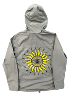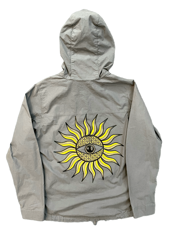 Step into the light of consciousness with the EY3DREAM Solar Vision Anorak—a weather-ready jacket infused with mystic energy. Crafted in a sleek charcoal shell, the back features a bold golden sunburst encircling the all-seeing eye, symbolizing clarity, protection, and awakened vision. Lightweight yet durable, it’s designed for seekers, dreamers, and creators who carry cosmic awareness into the everyday. Whether on city streets or open horizons, this jacket channels balance, resilience, and esoteric style.